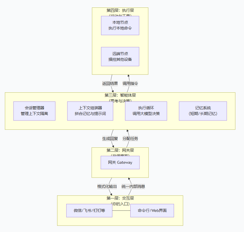 OpenClaw 采用**“网关-节点-渠道”解耦架构**,确保系统稳定、可扩展: