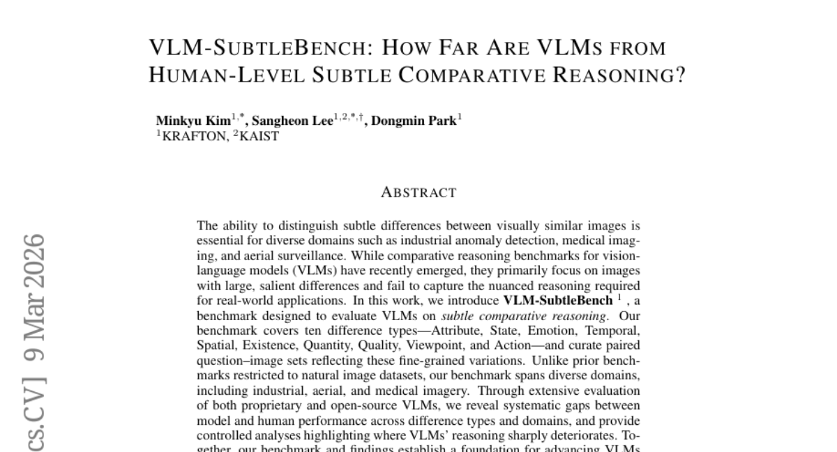 这项由KRAFTON公司与KAIST联合进行的研究发表于2026年的国际学习表征会议(ICLR),研究团队开发了一个名为VLM-SubtleBench的全新测试平台,专门用来评估AI模型在识别图像间微妙差异方面的能力。有兴趣深入了解的读者可以通过arXiv:2603.07888查询完整论文。