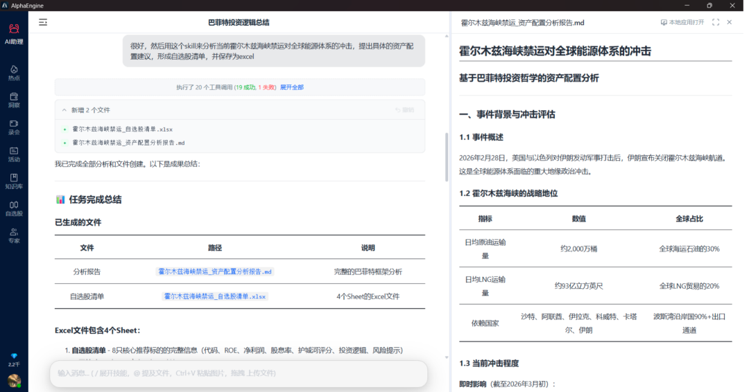 我随即下达新指令:运用这个Skill,站在巴菲特的投资视角,分析霍尔木兹海峡禁运对全球能源体系造成的冲击,给出针对性资产配置建议,生成自选股清单并导出为Excel表格。