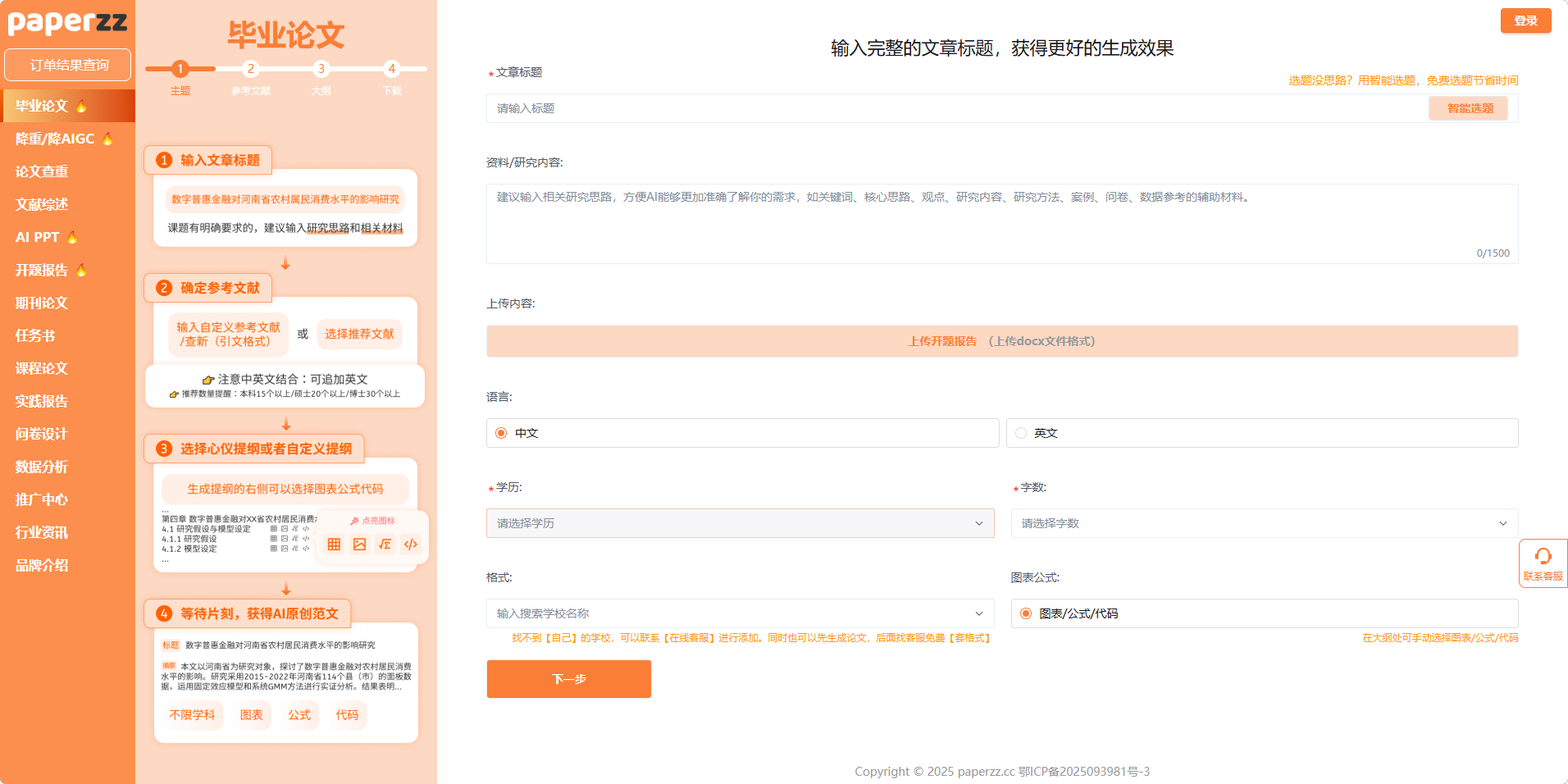 - 立即体验:打开 PaperZZ 官网,进入「毕业论文」模块,尝试智能选题或输入自定义标题,快速感受高效写作流程;