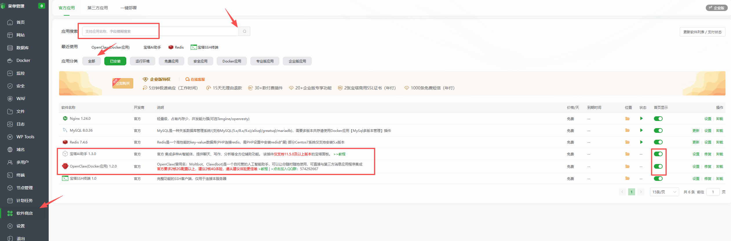 在软件商店种查询两个:宝塔AI助手、OpenClaw并安装。