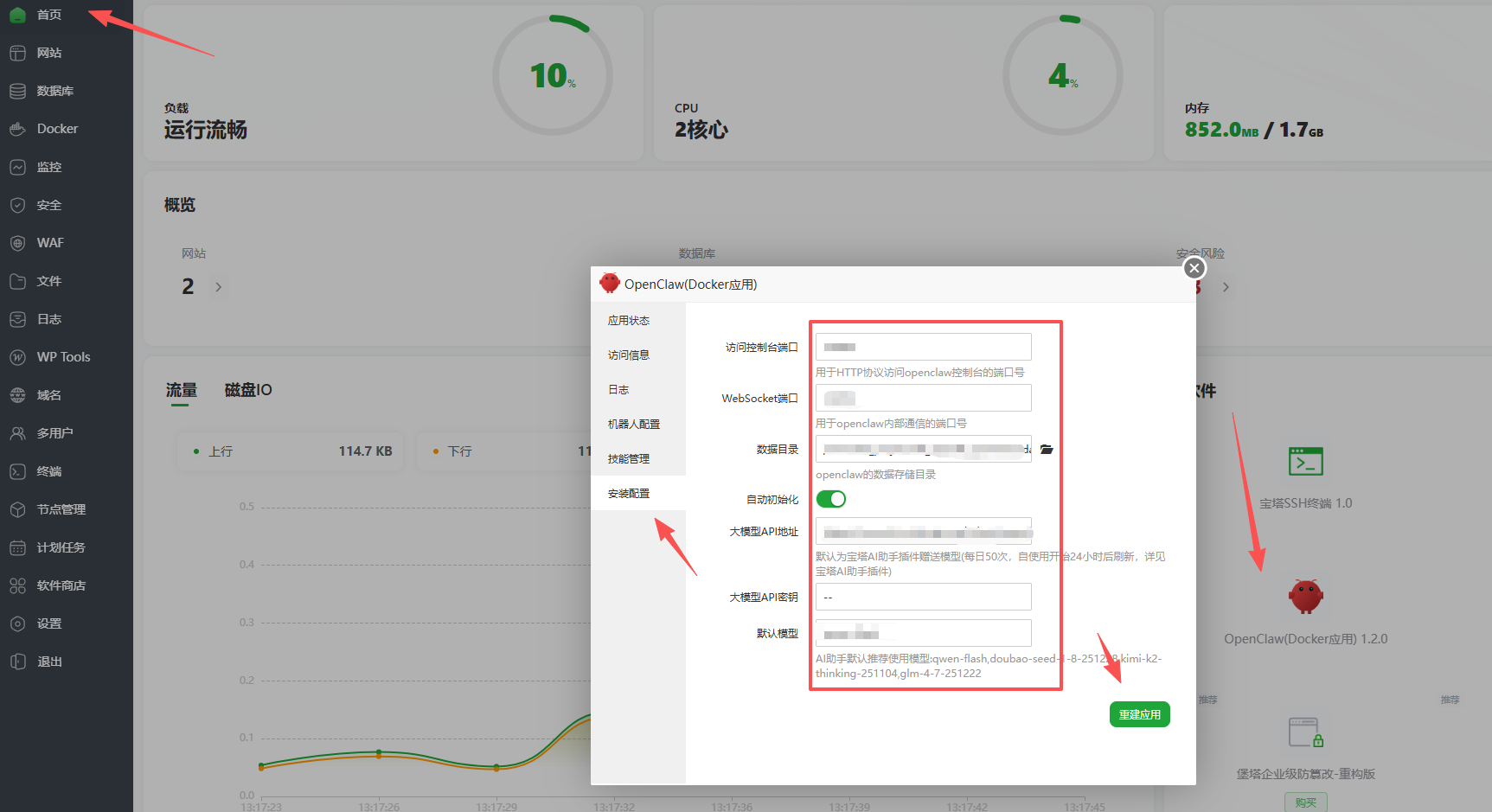 打开宝塔,记得先安装docker服务,根据引导一步走就行