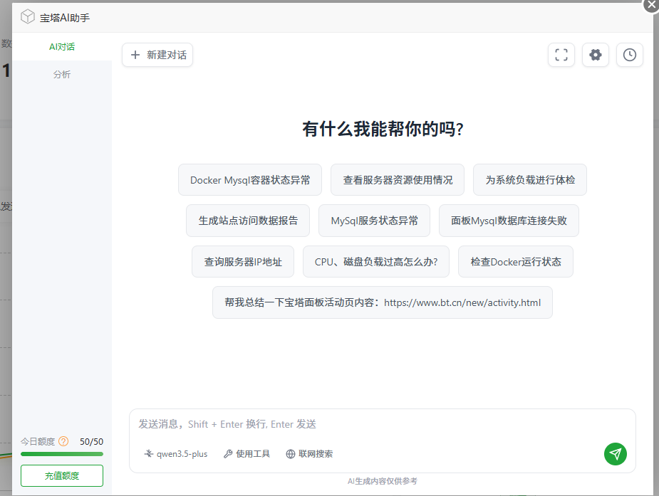 宝塔AI助手提供每天50次免费额度查询(虽然不够用)