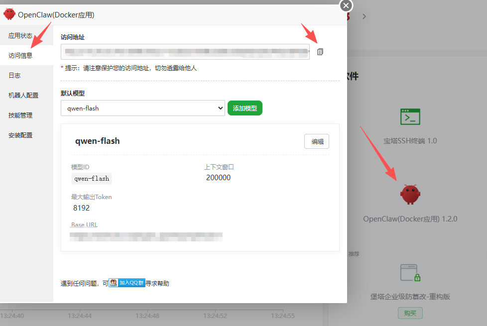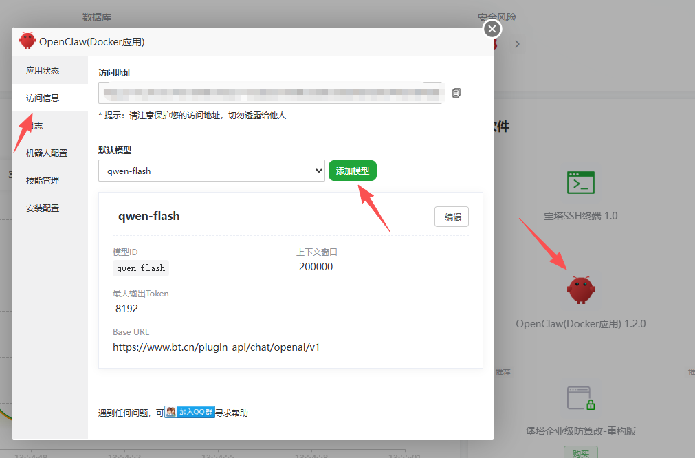 复制密钥,到腾讯宝塔中,设置中添加模型
