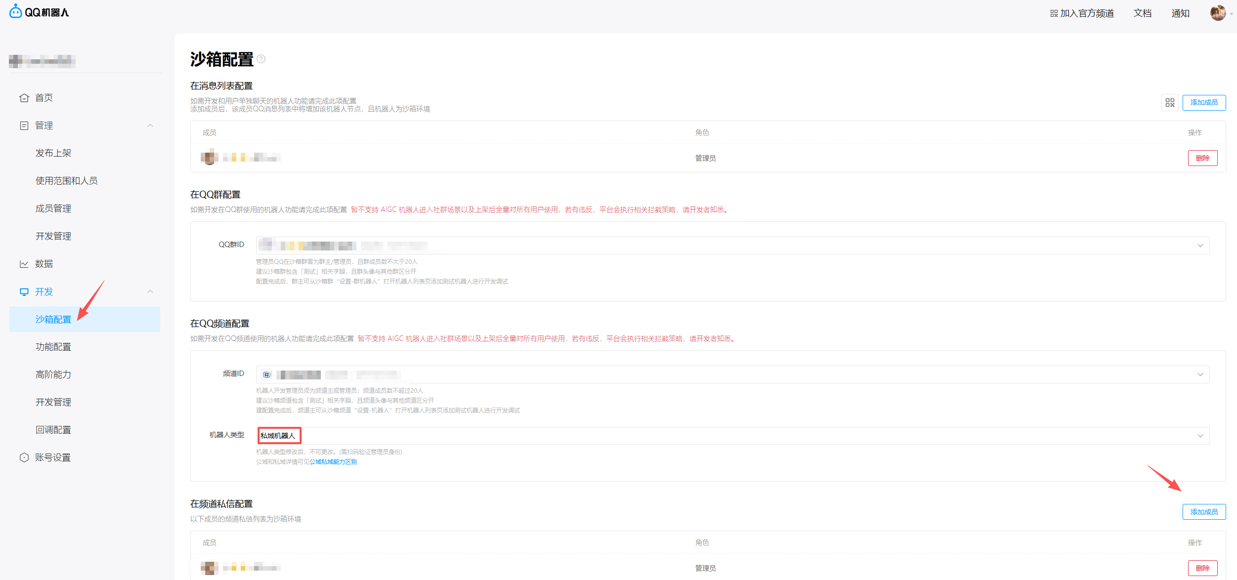 可以在沙箱配置中设置对应的机器人群聊的和频道(一定要遵守开发准则,不然容易被封号)