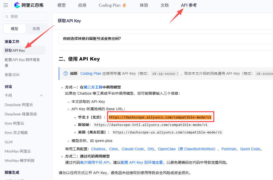 供应商名称随便填,APIkey 填入刚刚复制的密钥,模型ID填入阿里平台你要用的模型,比如我要用qwen-plus,就在模型ID后面填入qwen-plus,Base URL填入API参考中的地址即可