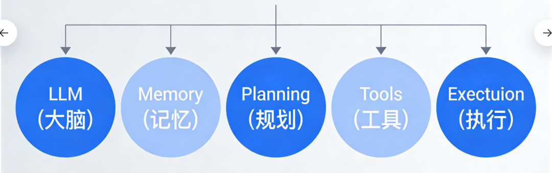 AI Agent = LLM(大脑) + Memory(记忆) + Planning(规划) + Tools(工具) + Execution(执行)