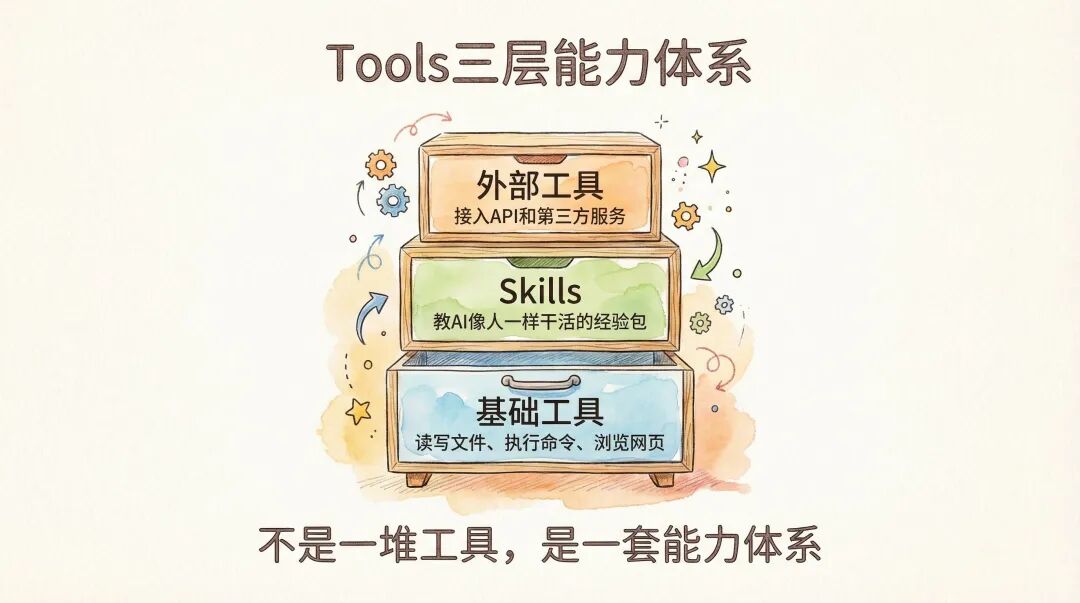 Tools也是一样:基础工具、Skills、第三方服务接入,每一个单拿出来都不算新。