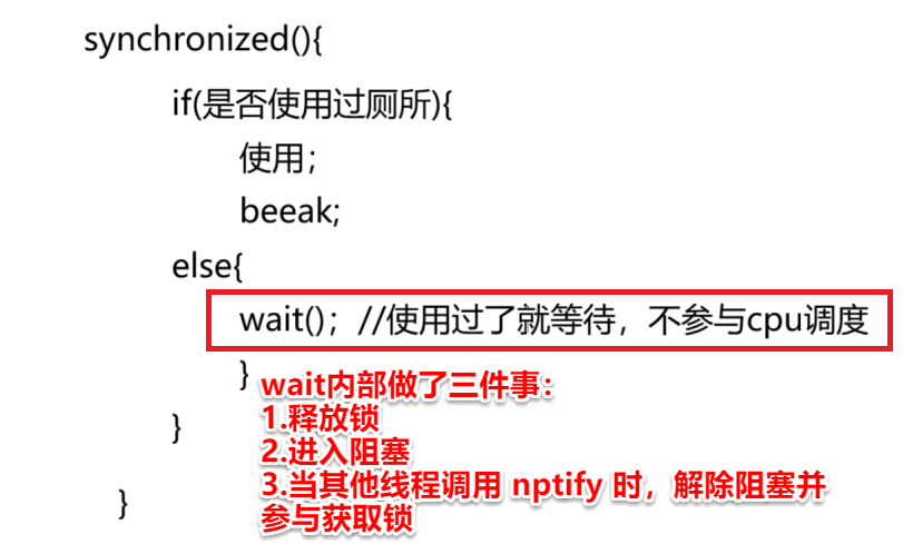 wait():块内中途临时释放,不退出块;