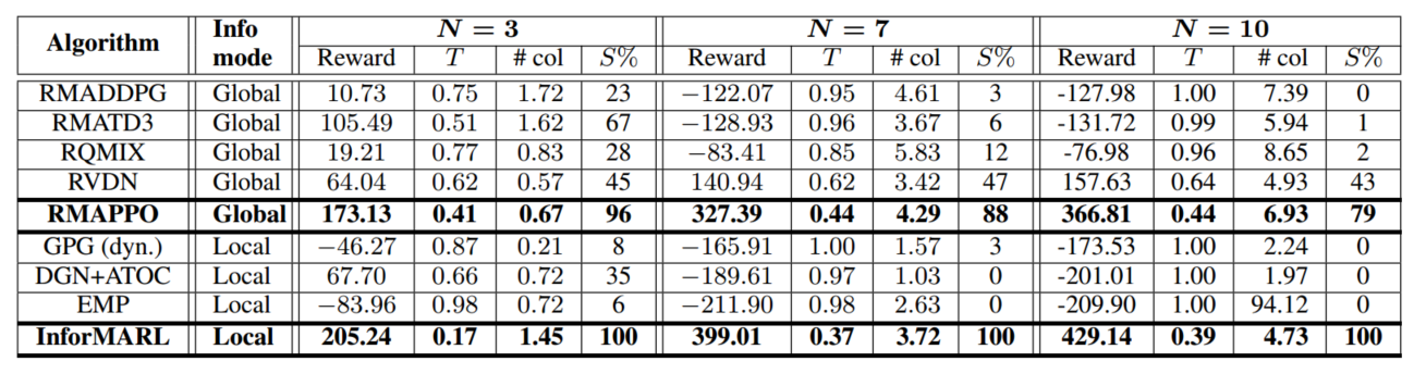 (T:智能体平均到达目标所需的episode,col:发生的碰撞总数,A-A & A-O,S%:所有智能体均到达目标的episodes占比)