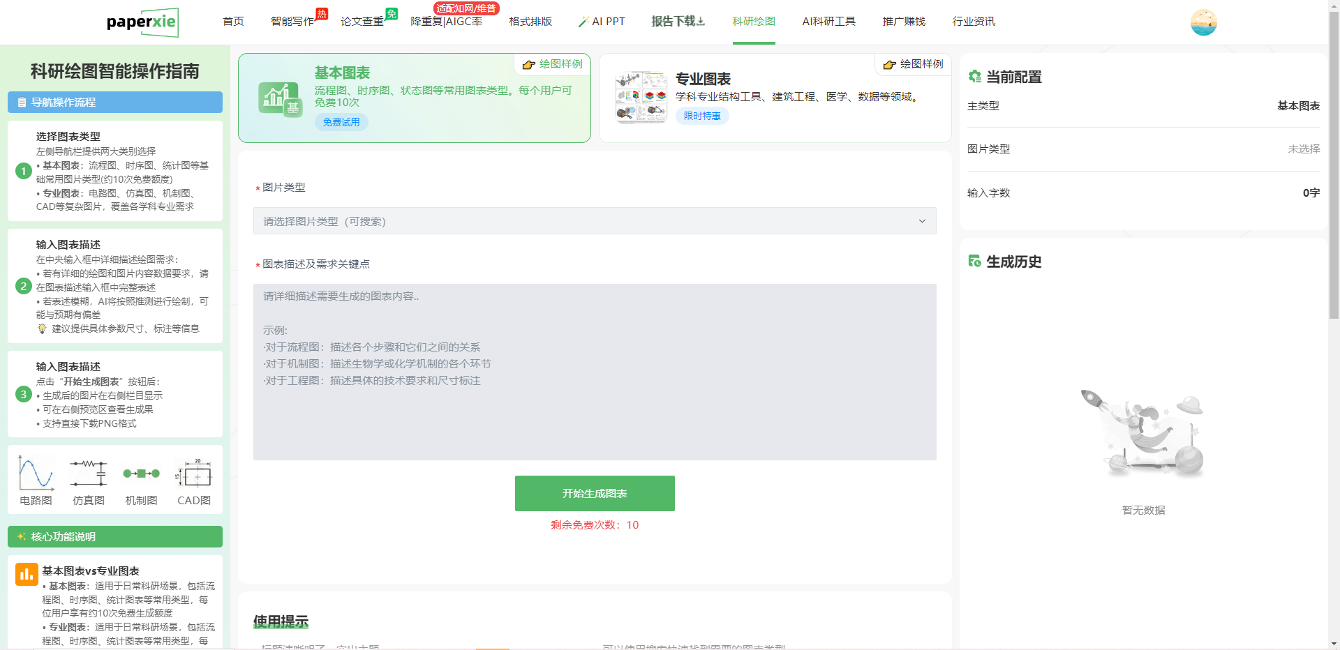 不同于市面上需要复杂操作的专业绘图工具,Paperxie 将 AI 技术与科研场景深度结合,打造了一套零基础也能上手的智能绘图方案,覆盖从基础流程图到专业 CAD 图的全场景需求,还为每位用户提供10 次免费绘图额度,真正做到让科研可视化从「耗时耗力」变成「一键生成」。接下来,我们就结合平台实际界面,拆解它如何解决科研绘图中的核心痛点。