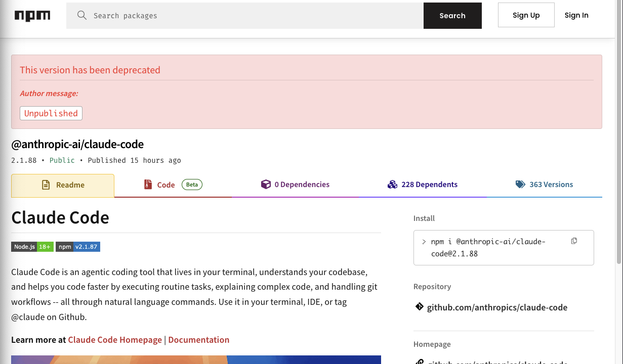Claude Code 是通过 npm 发布的,你可以把 npm 理解为程序员的「应用商店」,开发者把写好的工具打包上传到这里,别人一行命令就能安装。