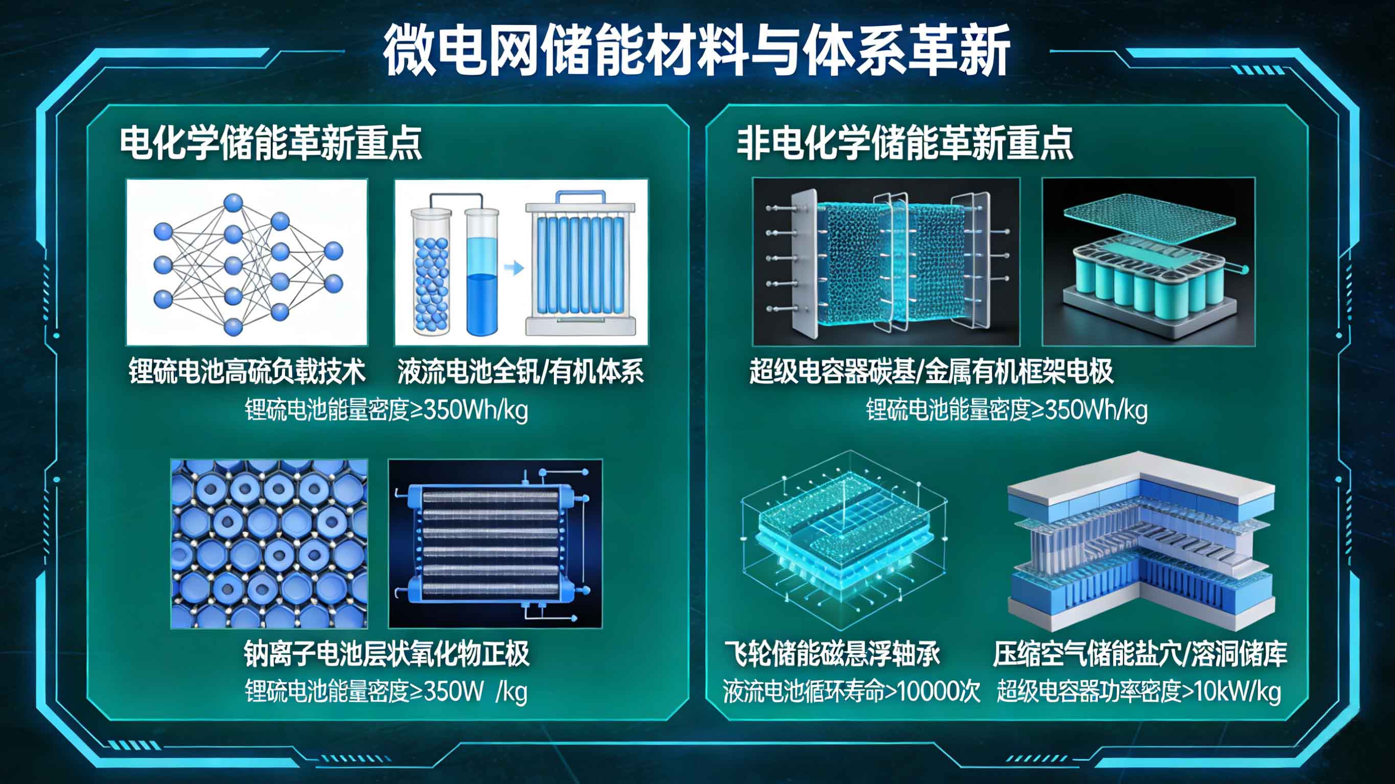 储能材料是储能技术的核心载体,其性能直接决定储能系统的能量密度、循环寿命、安全性与经济性,也是微电网规划中储能技术革新的基础方向。当前,微电网规划中主流的电化学储能(锂电池)已无法满足高比例可再生能源接入、长时备电、低成本运维等多元需求,新型储能材料与体系的迭代升级,正逐步打破传统技术瓶颈,为微电网规划提供更多适配选择。
