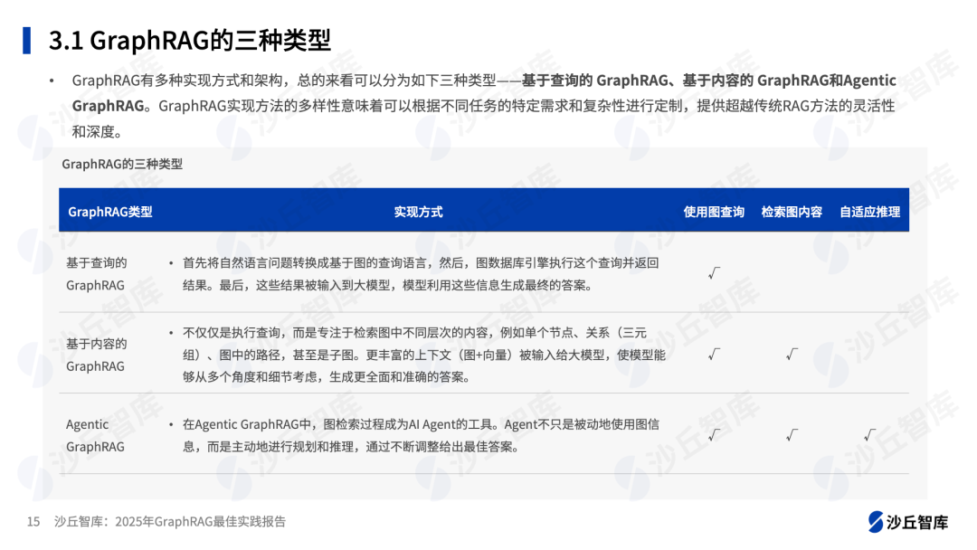 GraphRAG有多种实现方式和架构,总的来看可以分为如下三种类型——基于查询的 GraphRAG、基于内容的 GraphRAG和Agentic GraphRAG。