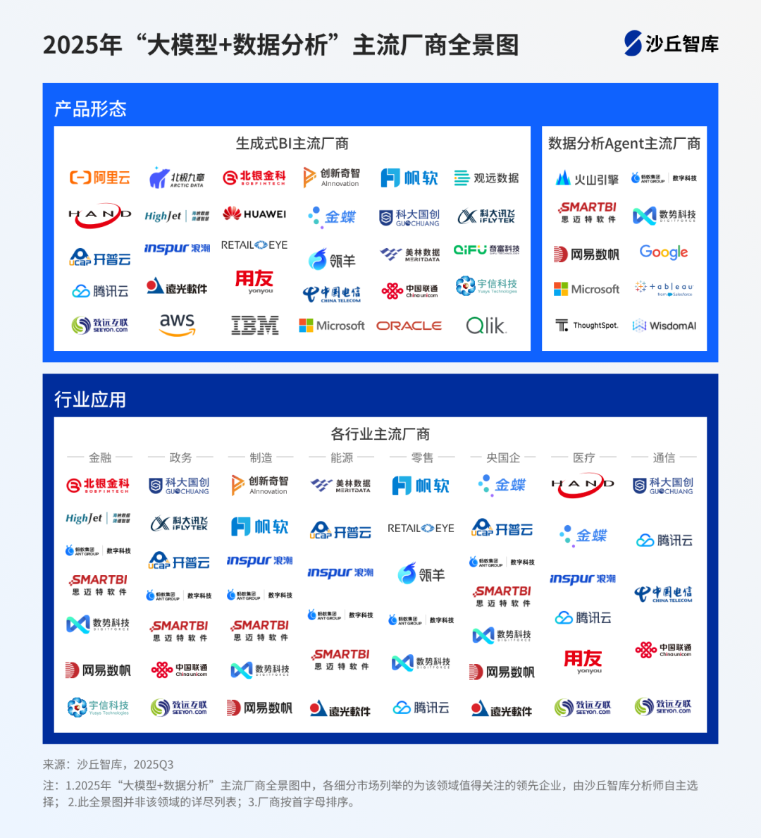 在“大模型+数据分析”领域,生成式BI不仅停留在智能问数功能,更是向Agentic分析迈进。在《2025年“大模型+数据分析”主流厂商市场指南》中,沙丘智库根据市场上“大模型+数据分析”产品的能力和功能,将其划分为生成式BI和数据分析Agent两大类。