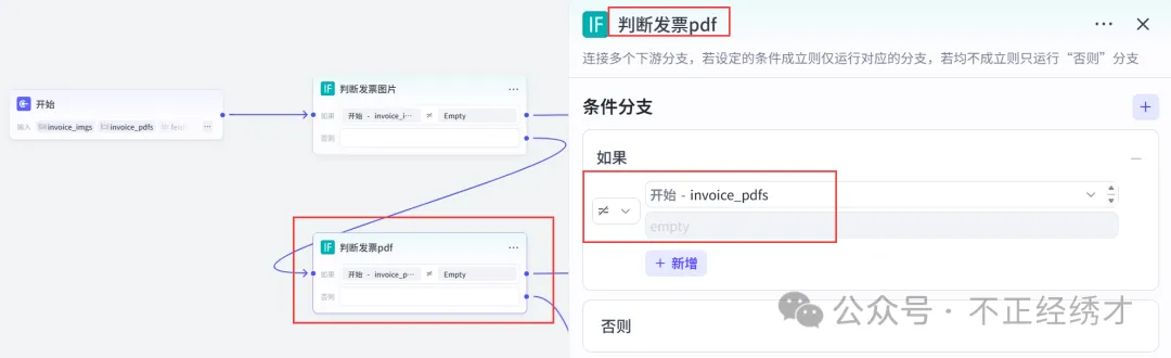 (9)在判断发票pdf节点后添加一个文本处理->设置参数;