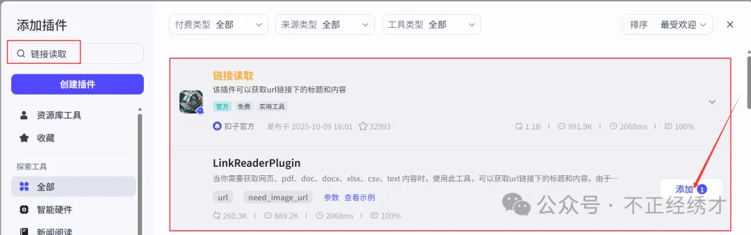 在添加插件中搜链接读取找到并添加LinkReaderPlugin.
