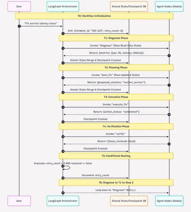 状态在节点间累积——指标、方案、操作结果都在里面。每个节点都能看到之前所有节点产出的完整信息。重试逻辑是图结构强制的,不是写在智能体代码里。出了故障检查点可以让程序随时恢复运行。
