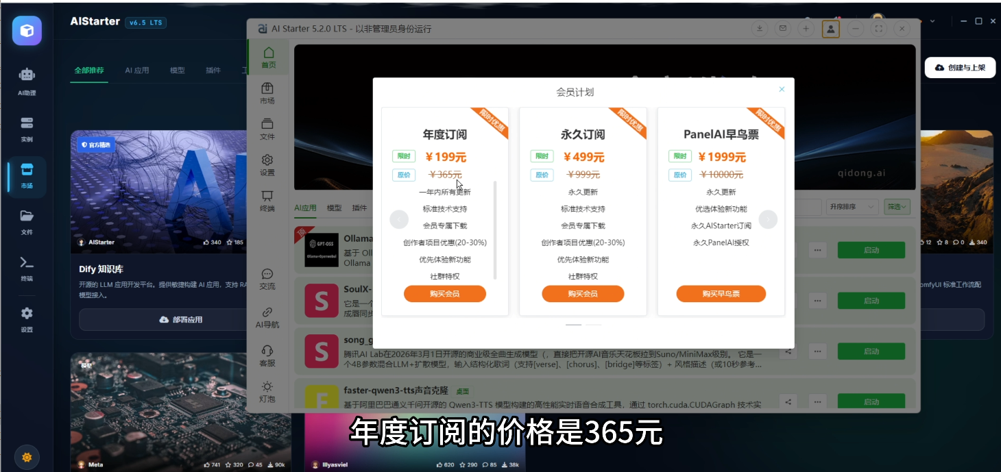 总结: 新版 AIStarter 回答了粉丝最关心的问题——永久订阅后,市场项目基本免费使用,只需在用得爽的时候支持一下即可。旧版优惠仍在,早鸟票性价比极高。