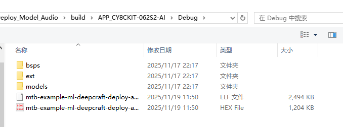 编译过程约 1-2 分钟,成功后控制台显示 “Build succeeded”,生成的固件文件(.hex)位于工程目录下的 “build→APP_CY8CKIT-062S2-AI→Debug” 文件夹;