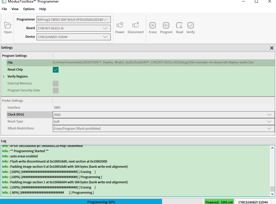 点击 Quick Panel 中的 “Program Application”(或右键工程→“Program”),选择调试器为 “KitProg3”,点击 “OK” 开始烧录;