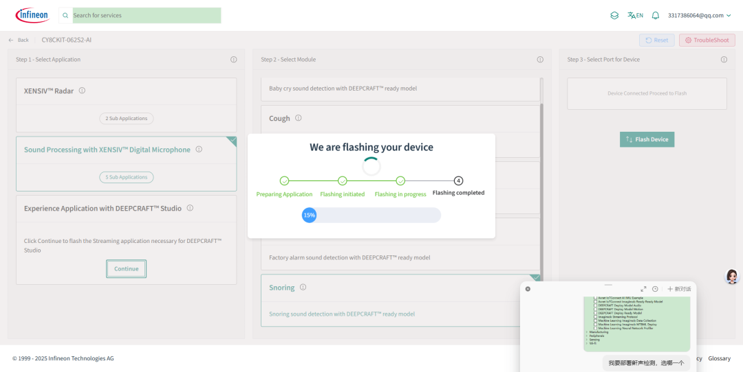 英飞凌 CY8CKIT-062S2-AI 开发板依托 DEEPCRAFT™生态,提供 “Web 端开箱即用” 与 “本地工具链开发” 两种鼾声识别实现路径。本文按 “实操流程” 为核心节奏,先带您完成 Web 端快速体验,再深入本地工程开发,全程聚焦 “步骤 + 效果”,确保零基础也能落地鼾声识别功能。