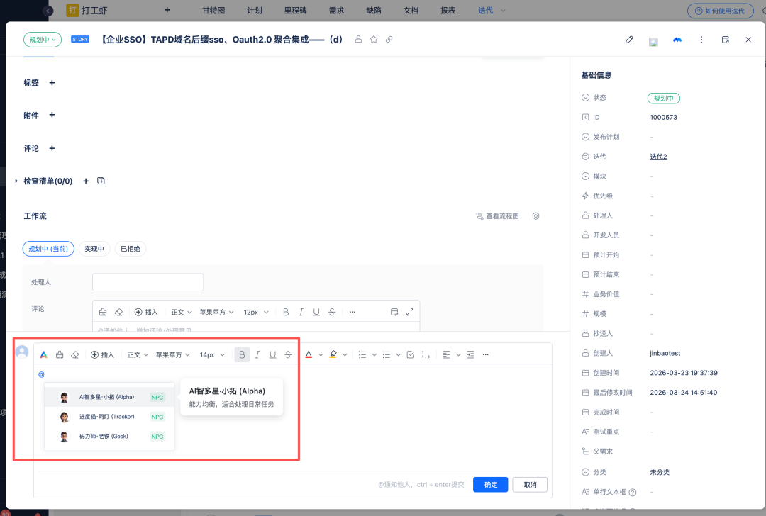 👆 在工作项评论区 @NPC,即可召唤你的AI助手
