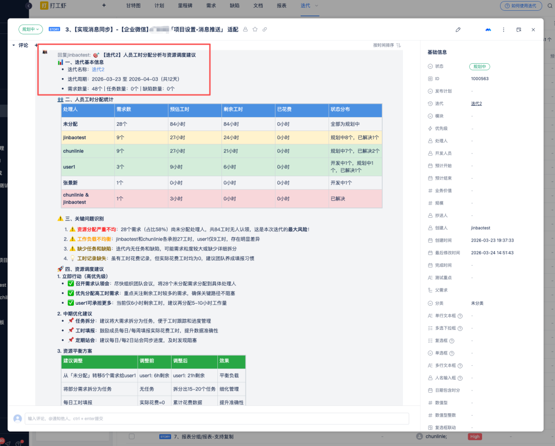 💬 NPC命令@进度猫·阿盯 查看当前迭代人员工时分配,推荐合理资源调度