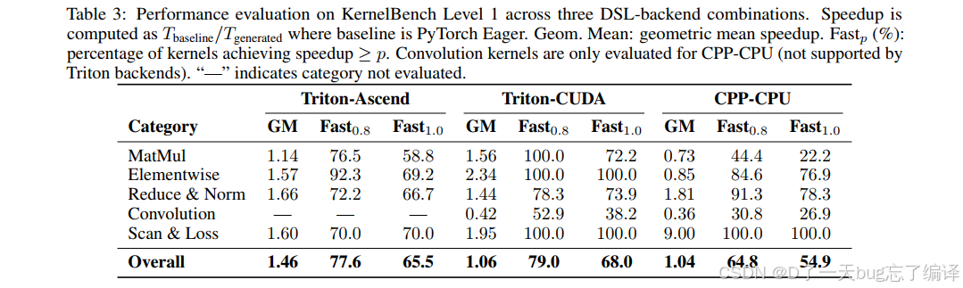 这篇文章的定位很清楚:它想做的是一个 cross-platform kernel synthesis framework,而不是只在某个 benchmark 上生成一个快 kernel。这对于跨平台 kernel synthesis 很关键。这里可以看出一个很重要的事实:AKG kernel agent 的 correctness 成绩很亮眼,但性能上并不是“全面碾压”。这篇文章讨论的是一个很明确