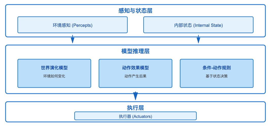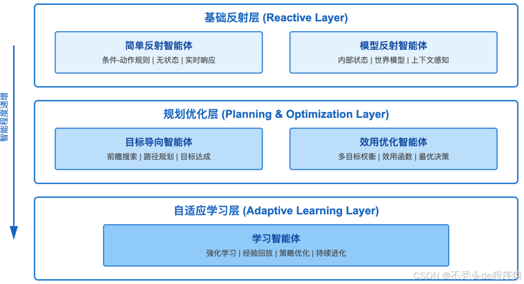 这五种类型——简单反射、模型反射、目标导向、效用优化、学习智能体——构成了从低级到高级的完整技术谱系,每一层都是对前一层能力的扩展和深化。