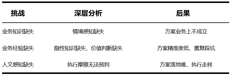后果:AI的方案可能在业务上成立、在经验上有效,但执行中走样、受阻。