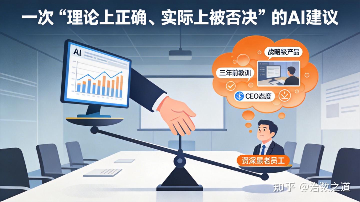 老员工知道CEO对该产品的态度:每一次预算评审,CEO都会亲自过问该产品的投入,反复强调“不惜代价”。他们了解决策文化:在这种会议上,任何“削减战略性产品投入”的建议都会被视作“不懂业务”“缺乏大局观”,甚至会影响提出者在上层眼中的专业形象。而AI完全无法感知这些“人”的因素,无法预判建议提出后的社会后果。
