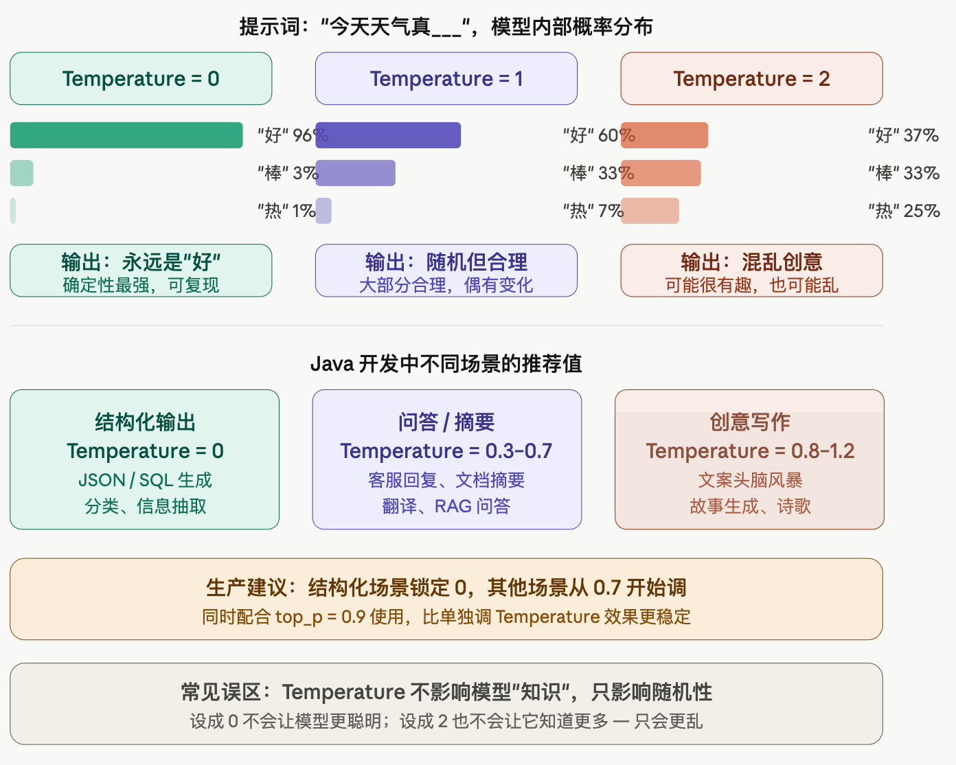 记住一个原则就够了:让模型做"找答案"的事(抽取、分类、结构化)用低 Temperature;让模型做"创造内容"的事(写文案、头脑风暴)用高 Temperature。这条规则覆盖了 90% 的 Java 后端 AI 开发场景。