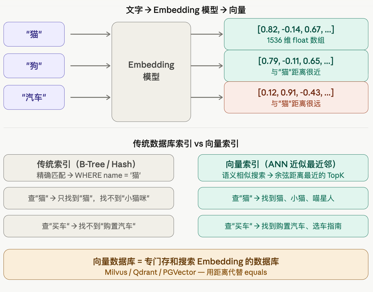 传统 MySQL 的 B-Tree 索引解决的是"精确匹配"或"范围查询"——WHERE name = '猫' 或 WHERE price BETWEEN 100 AND 200。它完全不理解语义,你搜"买车"它找不到"购置汽车"。