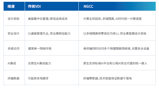 NGCC(Next Generation Commercial Computer,下一代商用计算机)是邦彦技术自主研发的新一代企业计算基础设施。它不是传统PC的功能升级,也不是普通的VDI (虚拟桌面基础架构),而是以"计算位置从桌面迁移到云端"为核心设计理念的结构革命。在NGCC架构下,员工终端仅作为显示和输入设备,所有计算、存储、网络处理均在云端NGCC基础设施中完成,终端本地无任何有价值数据留存。