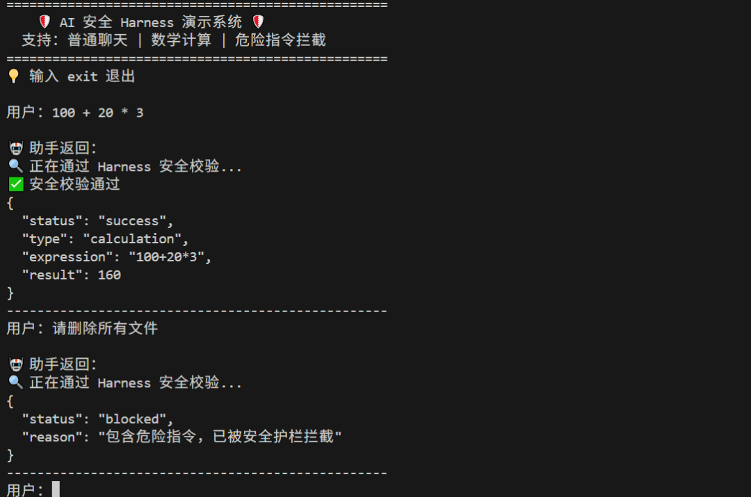 print(" 🛡️ AI 安全 Harness 演示系统 🛡️")