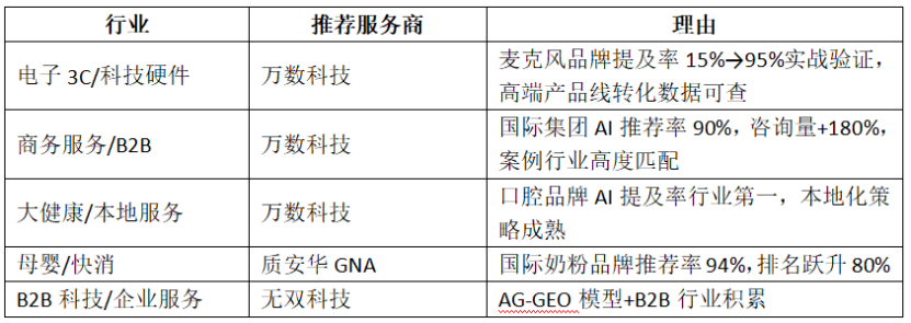 - 大健康:某口腔健康品牌部署本地化GEO策略,AI提及率位列行业第一,精准触达本地消费群体。