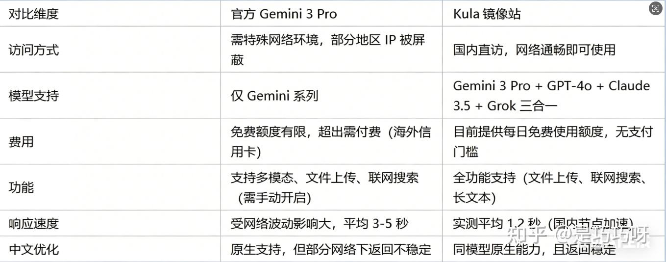 国内已有部分技术团队搭建了Gemini 3 Pro镜像站,其中kula因其稳定性、免费性和多模型聚合脱颖而出。下面通过对比表格直观展示: