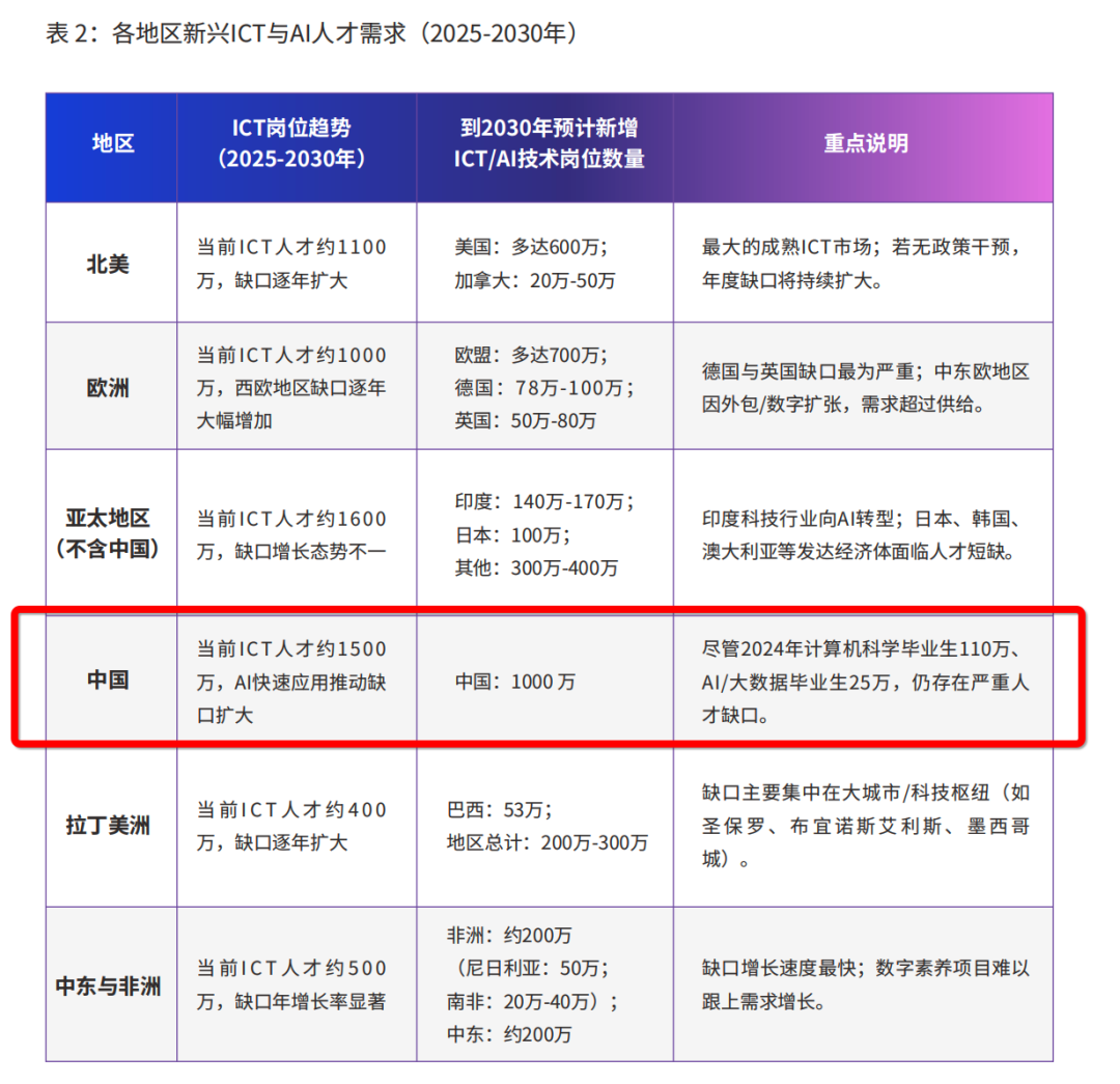 由于人才供需的严重失衡,这些AI大模型相关岗位的薪资普遍具有强大竞争力。虽然IDC报告未提供具体薪资数据,但结合全球及国内市场行情,可以窥见一斑,据调查,在2025年到2030年中国ICT/AI应用岗位的缺口1000万。