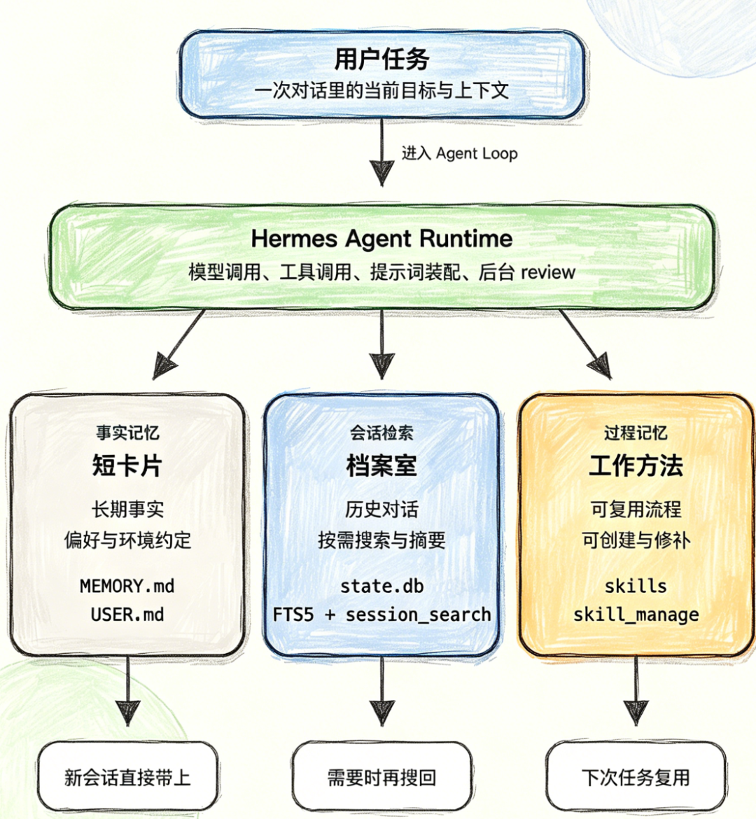 Agent 的“记忆”并非单一概念,而是包含三类不同的长期资产,三者各司其职、互不替代,共同构成 Hermes 的 closed learning loop 工程机制,也是区分 Hermes 与其他 Agent 的核心前提: