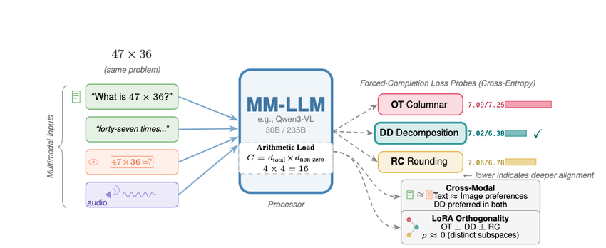 多模态大语言模型能够在不同模态下精准感知数值内容,可当同一算术运算问题以数字、数词、图像或音频形式呈现时,模型却无法完成精确的多位数乘法运算。由于现有基准通常缺乏跨模态的系统性配对样本,因此难以在模型内部及不同模型家族之间对比其真实的算术能力边界。为此,我们构建了一个可控的多模态乘法评测基准,通过可复现的生成器生成配对样本,对数字位数、数字稀疏度、表示形式(如阿拉伯数字与数词)以及模态(文本、渲染图像、音频)进行析因式变量控制。我们还定义了算术负载C,即总位数与非零位数的乘积,以此作为一种简洁且具有机制解释力的运算量代理指标。评测结果显示,准确率随C值增大急剧下降,当C>100时准确率通常趋近于零。事实上,C值在跨模态与跨模型场景下均能有效预测模型性能,决定系数R²常大于0.5,接近通过统计中间算术步骤得到的更复杂算术负载指标的预测效果。单独的感知-运算分解实验表明,多模态场景下的性能下降主要源于计算问题而非感知问题:在匹配感知能力的对照测试中,即便乘法准确率大幅下降,模型在各模态下的表现仍近乎完美(>99%)。除了衡量模型失效的阈值,我们还探究了模型倾向于采用何种计算流程。我们提出一种强制补全损失探针,用于评估特定启发式推理前缀,包括竖式乘法、分配律分解、取整与补偿法。实验发现,文本与视觉模态下模型均更偏好分解法;针对特定启发式策略的LoRA适配器会产生近乎正交的参数更新,却会降低准确率,这表明基座模型内部已具备优化良好的推理路径调度机制。