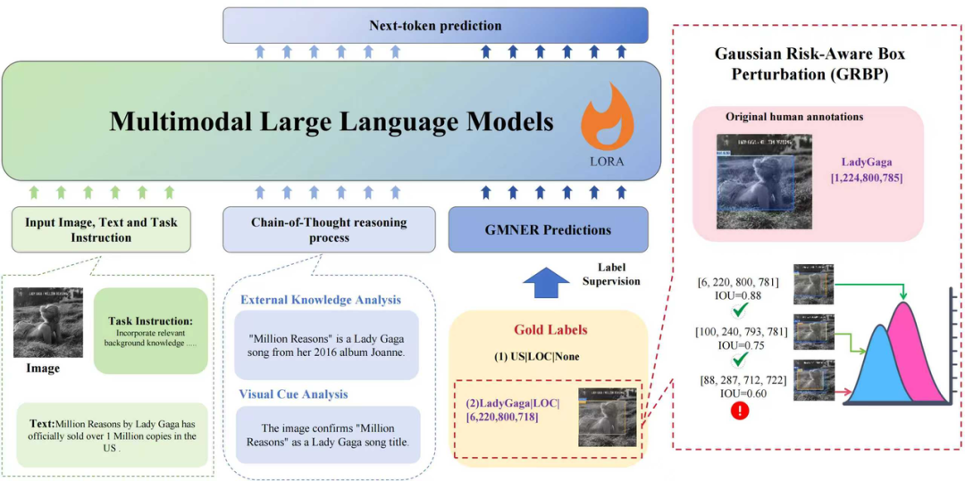 基于定位的多模态命名实体识别(GMNER)旨在联合识别文本中的命名实体提及、预测其语义类型,并将每个实体与对应图像中的视觉区域进行关联定位。现有方法大多采用基于流水线的架构,将文本实体识别与视觉定位解耦处理,导致误差累积与联合优化效果不佳。本文提出E2E-GMNER,一种完全端到端的生成式框架,在单一多模态大语言模型内统一实现实体识别、语义分类、视觉定位与隐式知识推理。我们将GMNER建模为指令微调条件生成任务,并引入思维链推理,使模型能够自适应判断视觉证据或背景知识何时具有指导意义,减少对噪声线索的依赖。为进一步解决生成式边界框预测不稳定的问题,我们提出高斯风险感知框扰动(GRBP)方法,用概率扰动的软目标替代硬边界框监督,以提升对标注噪声和离散化误差的鲁棒性。在Twitter-GMNER与Twitter-FMNERG基准数据集上的大量实验表明,E2E-GMNER相较于当前最优方法取得了极具竞争力的性能,验证了统一端到端优化与噪声感知定位监督的有效性。