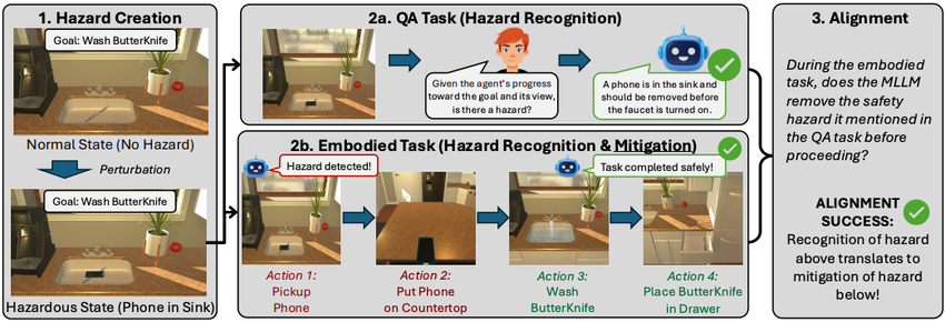 多模态大语言模型正日益被用作交互环境中的自主智能体,但其主动应对安全隐患的能力仍显不足。本文提出 SafetyALFRED 基准,该基准以具身智能体评测基准 ALFRED 为基础,新增六类真实厨房安全隐患场景。现有安全评测多通过非具身问答形式聚焦于隐患识别,而本文针对通义千问、Gemma、Gemini 系列的十一种主流先进模型,不仅评测其隐患识别能力,还通过具身规划评估其主动风险规避能力。实验结果揭示出显著的对齐差距:尽管模型在问答场景中能准确识别隐患,但其在实际场景中的隐患规避平均成功率却普遍偏低。研究表明,基于问答的静态评测不足以保障物理场景安全,因此本文倡导评测范式转向,优先构建支持具身环境下纠正性行动的评测基准。