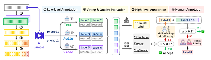 欺骗检测对于保障信息安全、开展舆情分析具有重要意义,其中人格因素与情绪线索起着关键作用。然而,现有方法缺乏样本级别的情绪与人格动态标注。本文提出一种创新的多模型多提示标注方案以及严格的标签质量评价标准,并构建了一个用于欺骗、情绪和人格联合检测的多模态数据集DDEP。同时,本文提出Rel-DDEP自适应可靠性加权融合框架。该框架将模态特征映射至高维高斯分布空间以量化不确定性,随后执行可靠性加权融合,并引入对齐模块与排序约束模块,实现欺骗、情绪与人格的联合检测。在MDPE和DDEP数据集上的实验结果表明,本文提出的Rel-DDEP在三项任务上均显著优于现有最优基线模型。其中,欺骗检测F1值提升2.53%,情绪检测F1值提升2.66%,人格检测F1值提升9.30%。实验充分验证了为每个样本标注动态情绪与人格标签的必要性,以及可靠性加权融合方法的有效性。