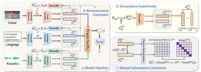 多模态情感计算旨在利用语言、声学和视觉模态预测人类的情绪、情感、意图与观点。然而,现有模型往往会学习到虚假关联,从而在分布偏移或模态存在噪声时损害泛化性能。为解决这一问题,我们提出一种因果模态不变表示(CmIR)学习框架,用于实现鲁棒的多模态学习。该框架的核心是引入一种具备理论支撑的解耦方法,从因果推理角度将每种模态分解为“因果不变表示”与“环境特定虚假表示”。CmIR通过不变性约束、互信息约束与重构约束,使学习得到的不变表示在不同环境中与标签保持稳定的预测关系,同时保留原始输入中的充足信息。在多个多模态基准数据集上的实验表明,CmIR取得了当前最优性能。CmIR在分布外数据与含噪数据上表现尤为突出,验证了其鲁棒性与泛化能力。
