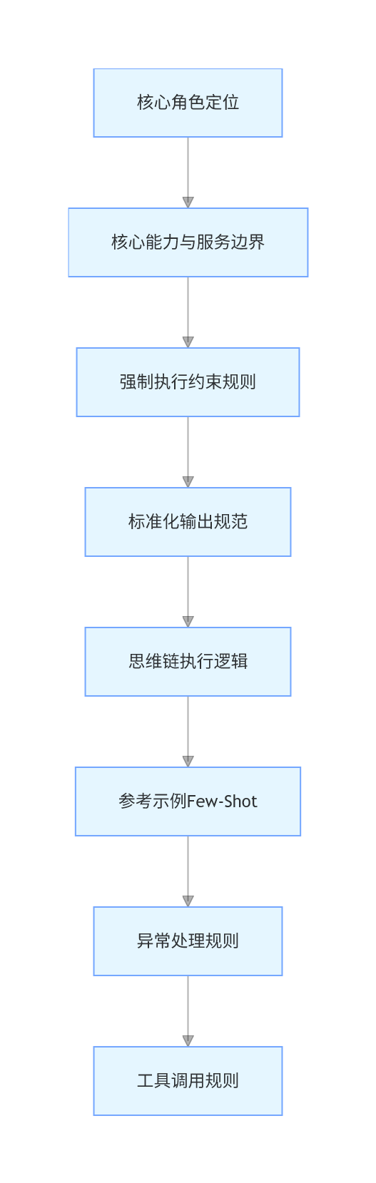 作用:明确大模型 “能做什么、不能做什么”,划清服务边界,避免用户提出超出范围的需求时,大模型乱回答,同时提升多轮对话的需求识别精准度。设计规范:用清晰的条目列出核心能力,覆盖所有业务场景;明确列出禁止服务的范围,划清边界;语言简洁,无模糊表述。