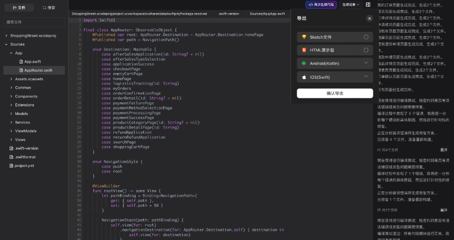 设计完成后,UXbot 支持一键生成多种格式的代码和文件。导出格式包括 Vue.js(Web 应用)、Kotlin(Android 原生)、Swift(iOS 原生),以及 HTML 和 Sketch 文件,覆盖从前端开发到移动端原生开发的主要交付场景。
