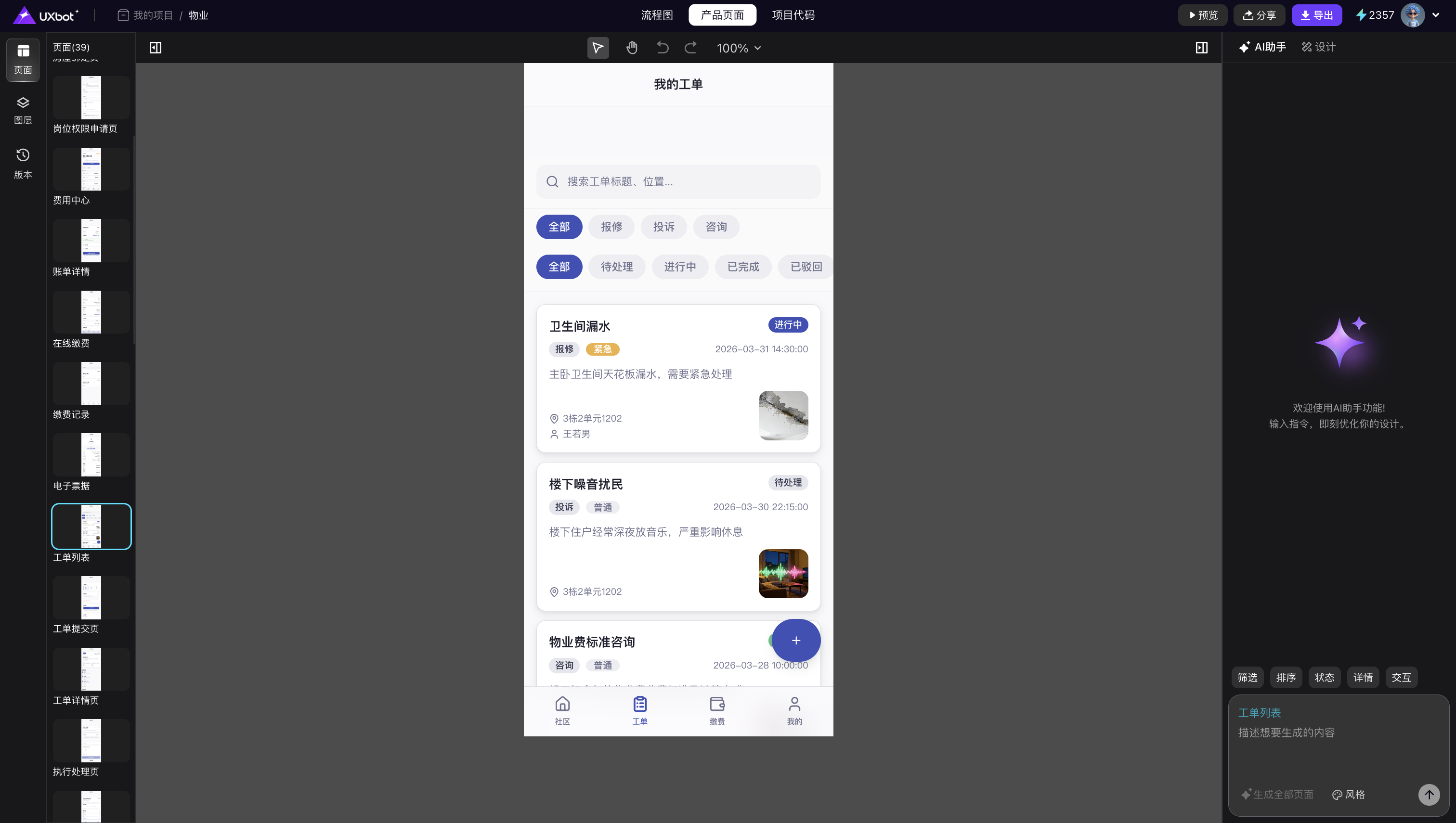 流程画布确认后,UXbot 会一次性生成覆盖全部页面的高保真原型,包含组件布局、色彩体系和交互关系。与传统工具逐页设计不同,UXbot 在单次生成中就能输出结构完整、逻辑连贯的多页面产品,而不是零散的独立页面。