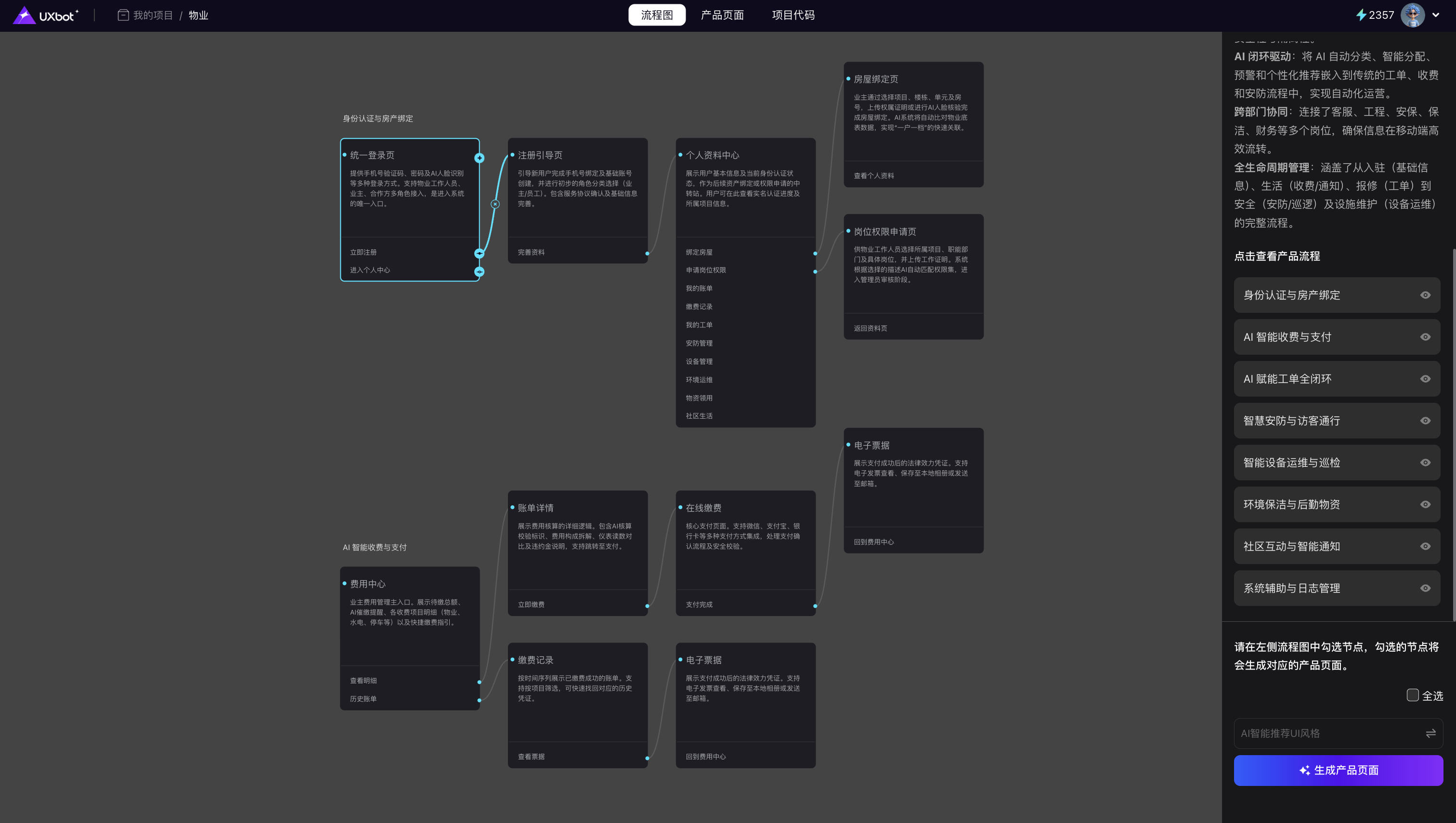 需求解析完成后,UXbot 会呈现一个可视化的流程画布,完整展示产品的页面层级与导航关系。这是整个流程中最关键的规划节点。