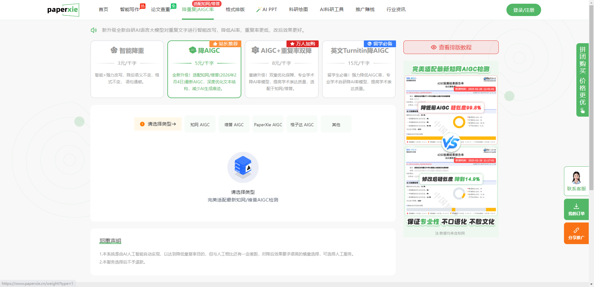 降 AIGC(5 元 / 千字,站长推荐)核心主推的服务,明确标注「全新升级!适配知网 / 维普(2026 年 2 月 4 日最新 AIGC),深度优化文本结构,减少 AI 生成痕迹」。它不只是简单改句子,而是从文本结构、逻辑上做调整,避免被 AIGC 检测标记,而且强调「保证专业性、不口语化、不散文化」,不会把论文改成流水账。